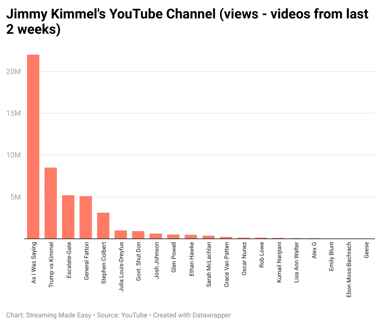 and I unpack the Jimmy Kimmel suspension mess and what it really says about late night TV and the direction of travel for broadcast TV at large. Kimmel’s return drew a ratings spike, but within 48 hours he had shed 64 percent of his audience. Should he go all in on YouTube?These drops tell you more than the suspension itself: the audience was only here for the headline moment regardless of the medium. This isn’t just a distribution problem, the late night format needs reinvention.