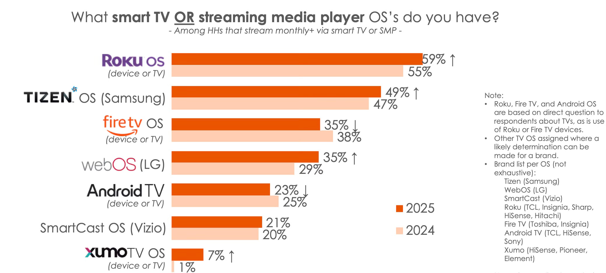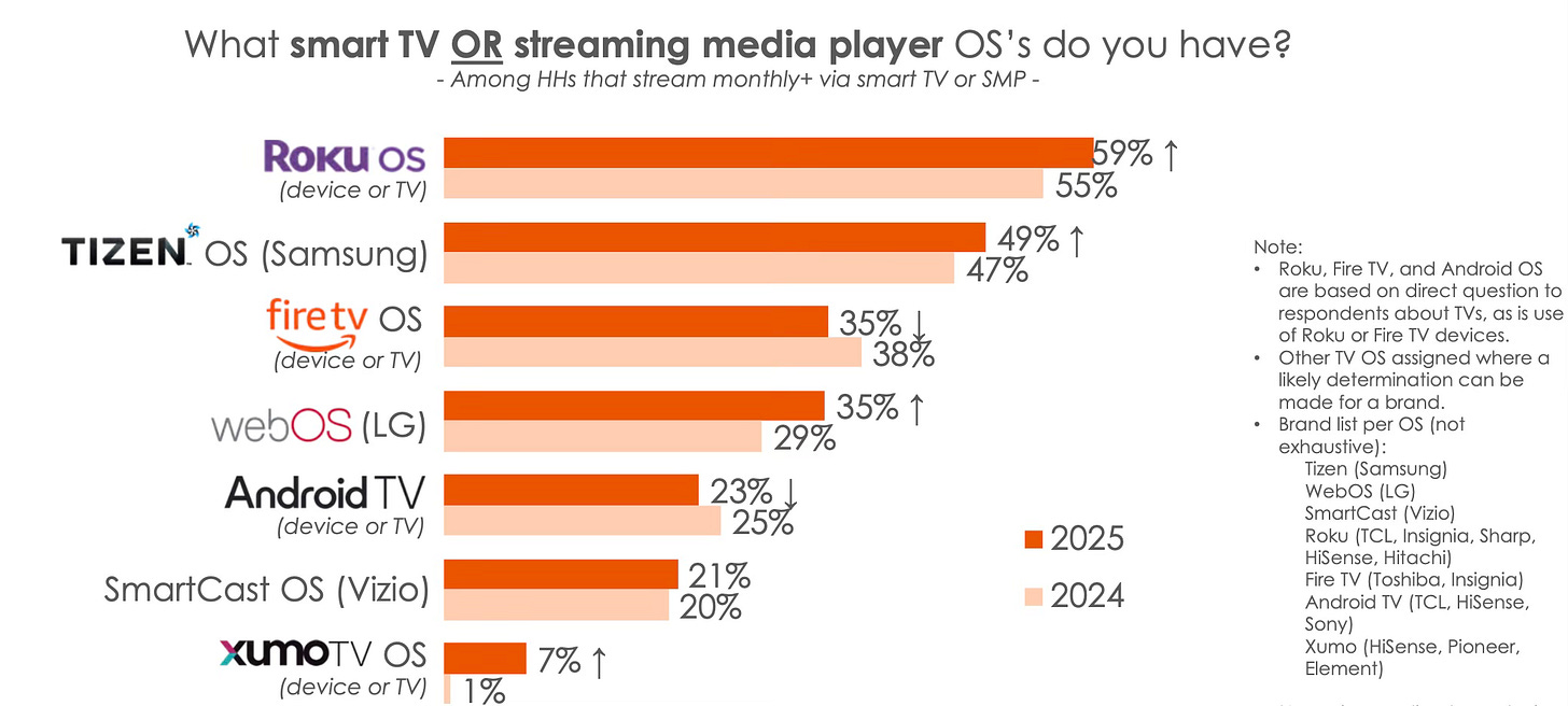 The numbers tell the same story. Twenty-five million units sold by 2015. Loup Ventures estimated 53 million active devices in 2019. By 2022, Strategy Analytics put tvOS in just 10 million U.S. households (8% of the market). Last year, Parks Associates put Apple TV at a ~10% market share while Apple TV doesn’t even pop up in the latest survey by Hub Entertainment Research.