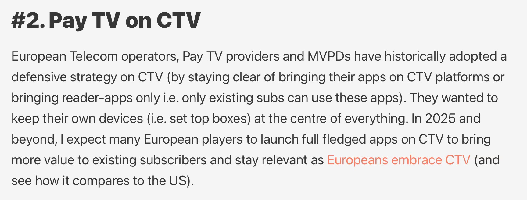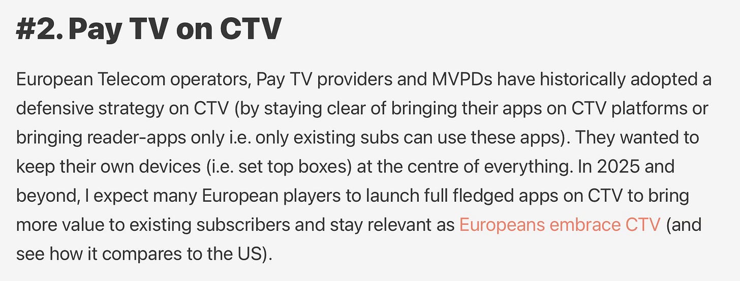 European telcos and Pay TV groups have started to (reluctantly) embrace CTV and launched native apps, dealt pre-installed status or dedicated remote buttons to be present on TV sets without systematically forcing proprietary hardware on customers.