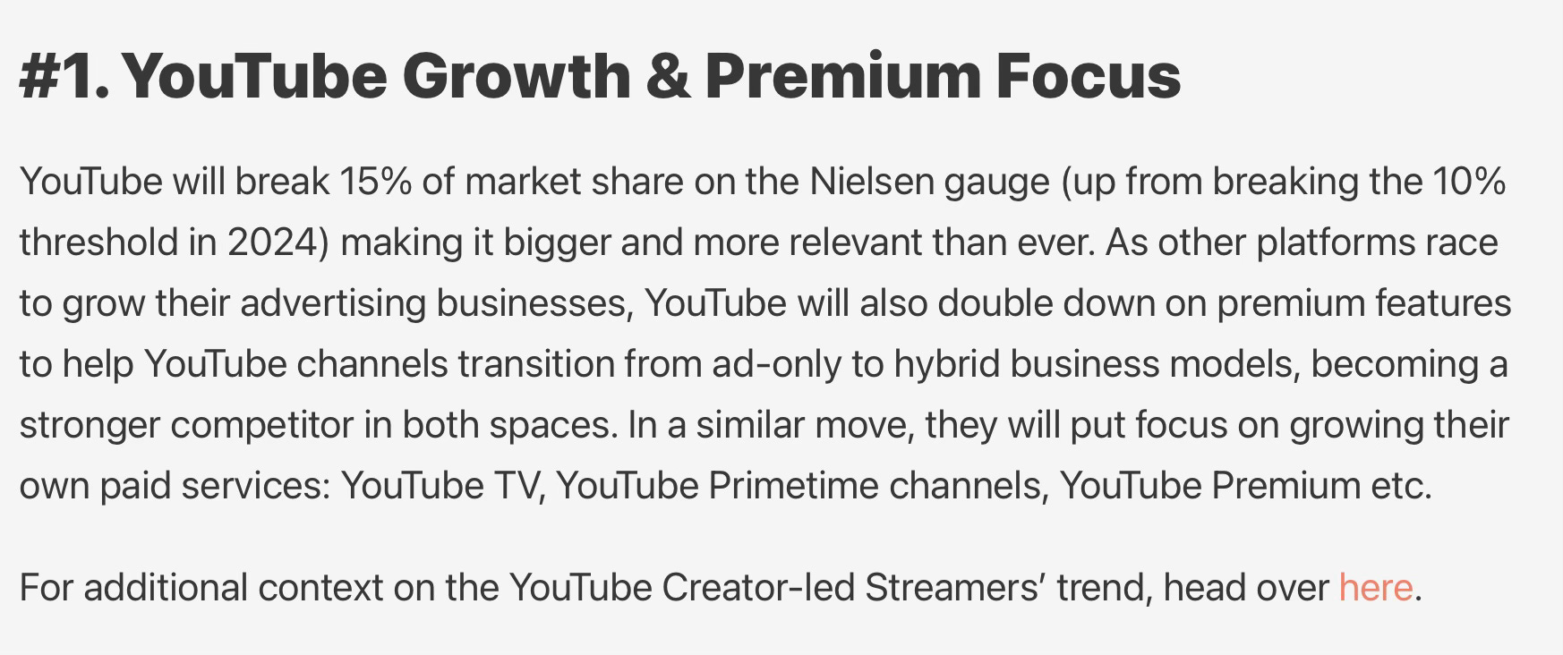 As for adding new premium features for channels transitioning from ad-only to hybrid models, YouTube expanded its Partner Program to include YouTube Shopping, Channel Memberships, YouTube BrandConnect to support branded content campaigns, and recently the YouTube Activation Partners program which connects advertisers with specialised agencies.