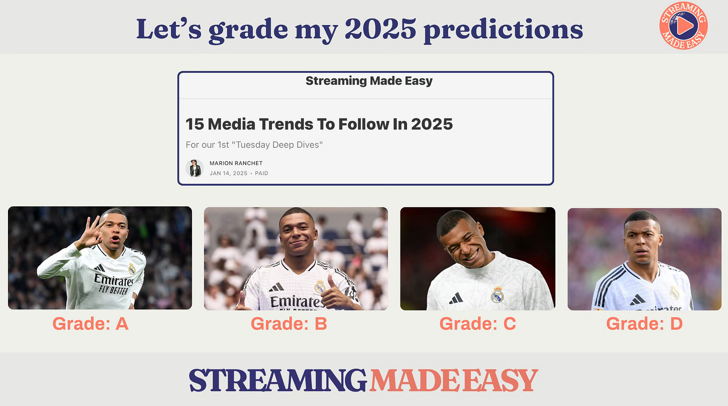 Today in Streaming Made Easy, I’ll grade my 15 predictions for 2025 the same way but trading Messi for Mbappé of course. Let’s go!