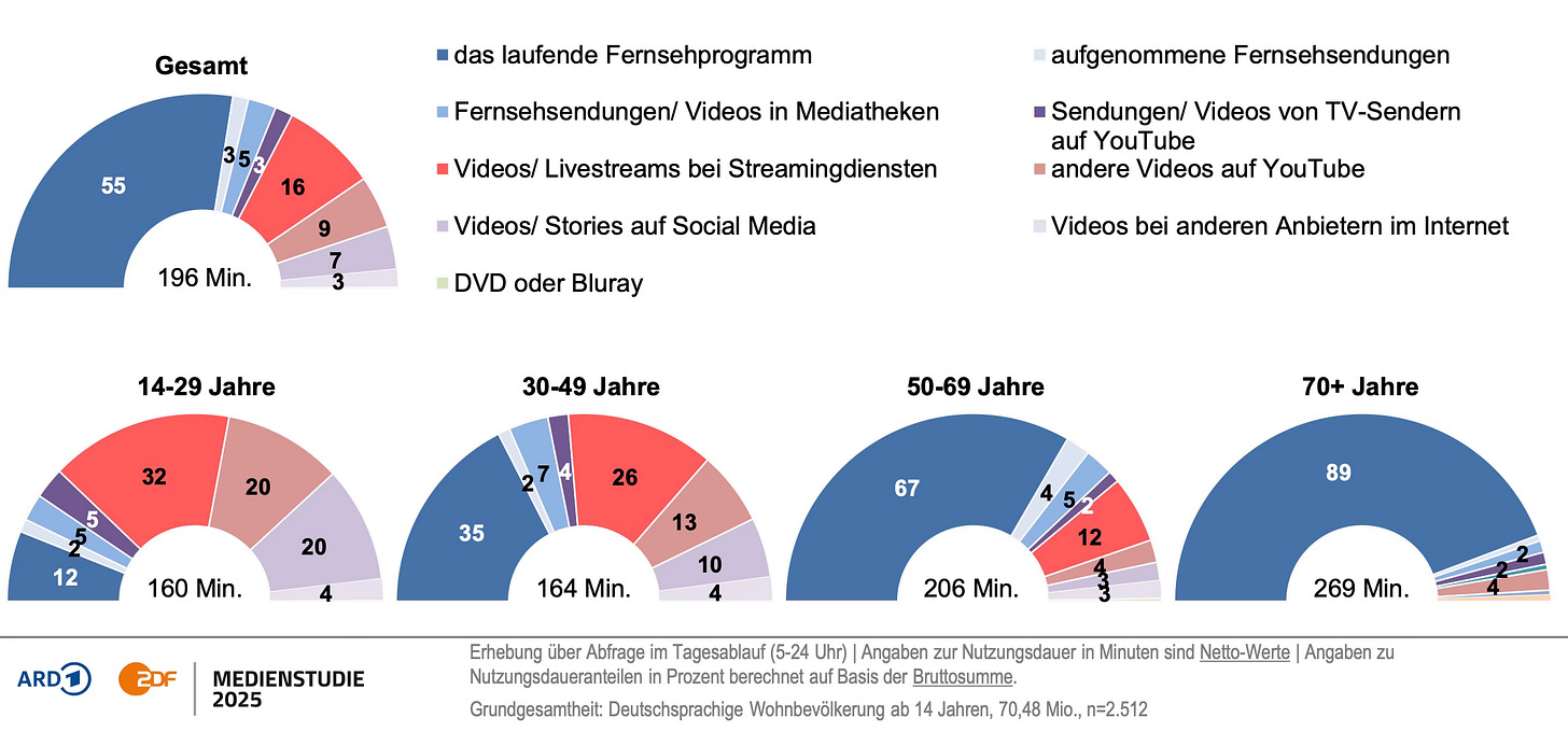 The ARD/ZDF Medienstudie 2025 just dropped: Germans still spend most of their video time with linear TV (55 %), but that share is slipping (down three points year-on-year). The winners? YouTube and social video, now capturing 19 % of total viewing time (up from 15 % in 2024).