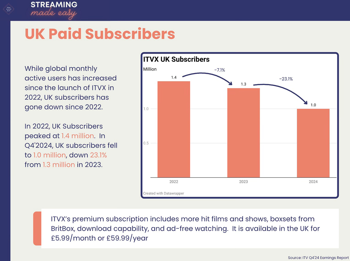 “We will prioritise our ad-funded proposition over our pay proposition to deliver the best return. As expected Subscription revenue was down as we consolidated subscriptions into ITVX. Partnerships and other revenue were lower as a result of the actions taken to drive viewing through ITVX”.
