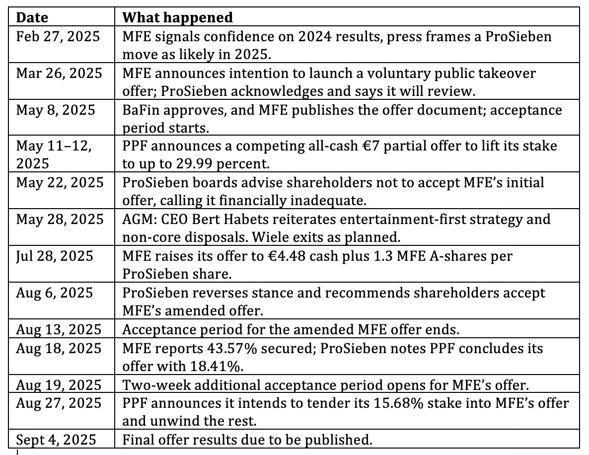In 2025, Italy’s MFE moved from persistent minority shareholder to de facto kingmaker at Germany’s ProSiebenSat.1, with PPF bowing out and tendering its entire stake. The result, pending final settlement, is a new center of gravity in European commercial TV and will be the ultimate test for the “pan-European champion” thesis. Let’s dig in.