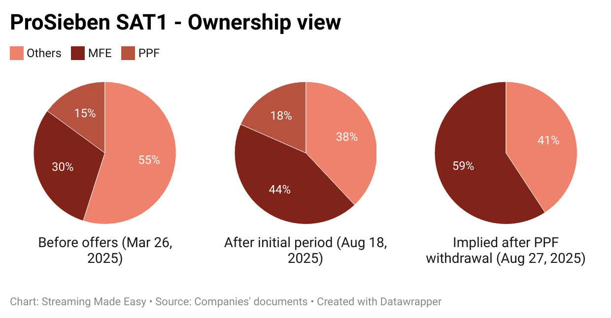 → PPF, a Prague-based investment group with telecom and media holdings across Central Eastern Europe, entered with an all-cash €7 partial offer to lift its stake up to 29.99 percent under German takeover rules, positioning itself as a financially driven alternative to MFE.