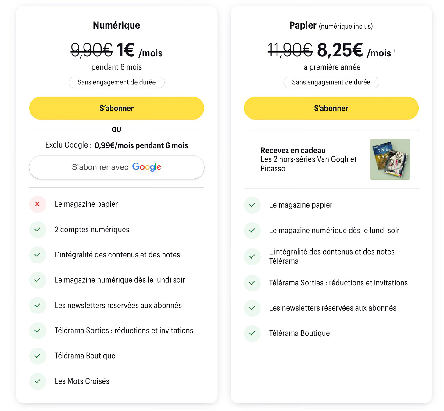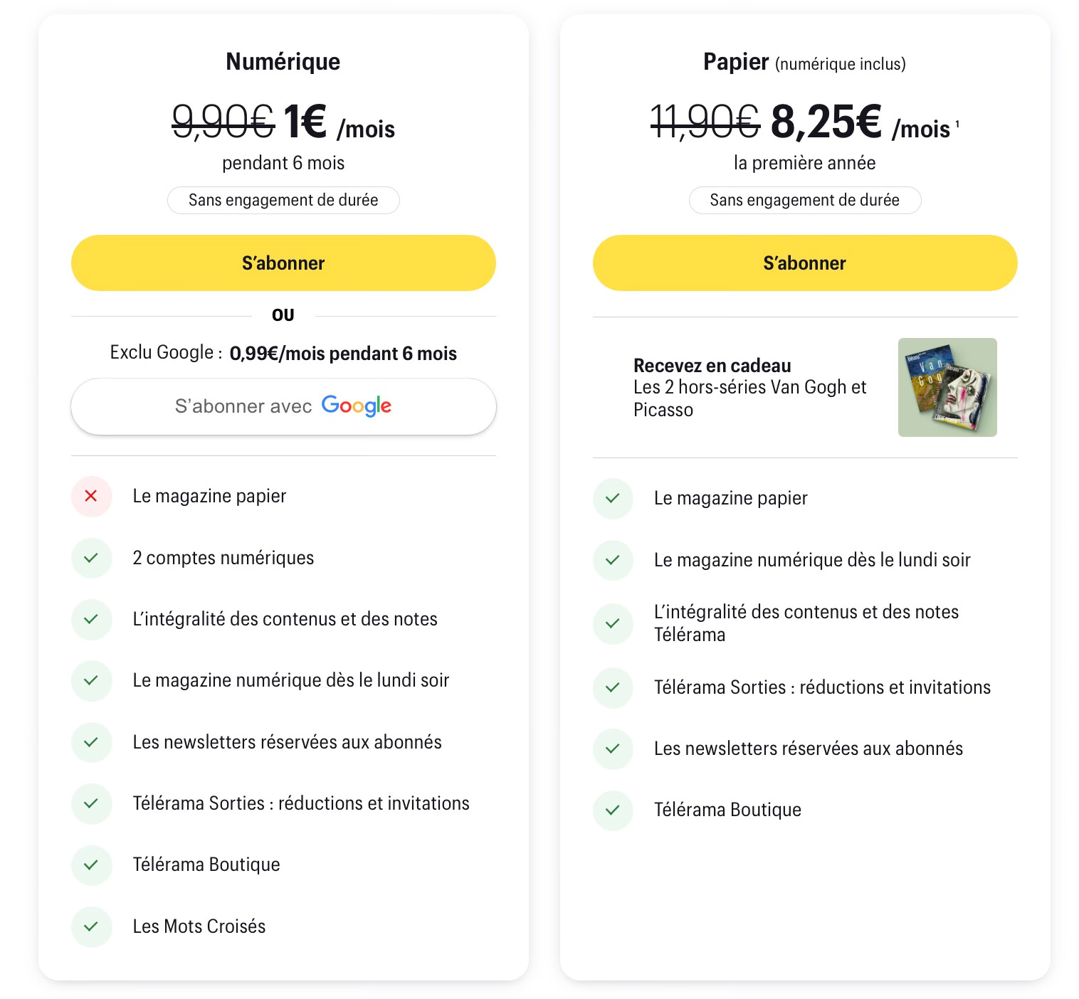 - Télérama Digital + Max Basic (with ads): €6.99/month (first year), then €11.99/month. - It represents a 8.99€ discount in year 1, 3.99€ onwards (bundle value: 15.99€)