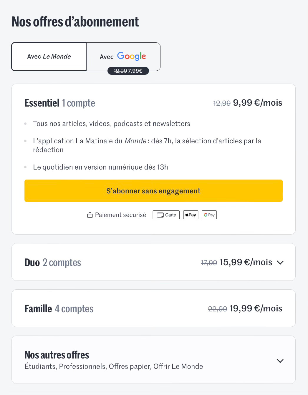 - Le Monde Essentiel + Max Basic (with ads): €14.99/month; - It represents a 3.99€ discount (bundle value: 18.99€)