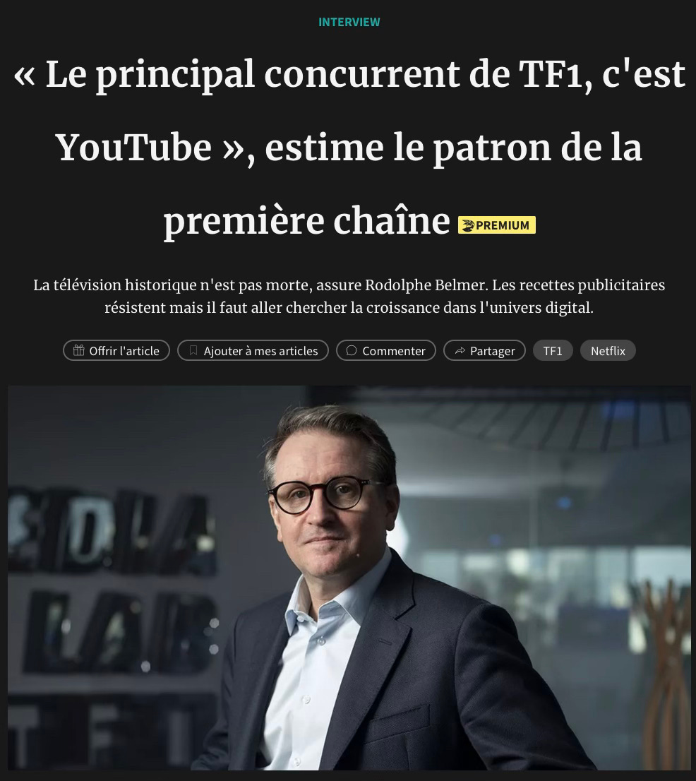 TF1’s CEO, Rodolphe Belmer, sees YouTube as TF1’s biggest competitor and he is very vocal about the amalgams being made between YouTube and Broadcasters with the slogan “YouTube is TV”.