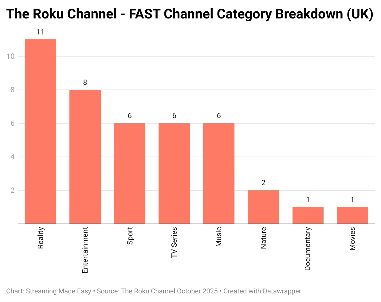 This feels like a soft launch, a test run built from U.S. feeds. Roku wants a foothold before building for the UK market. I expect 2026 to bring the best of global and local feeds. Until then, let’s dive into their genre breakdown, their launch partners, their own & operated channel line up, while comparing notes with market leader, Samsung TV Plus.